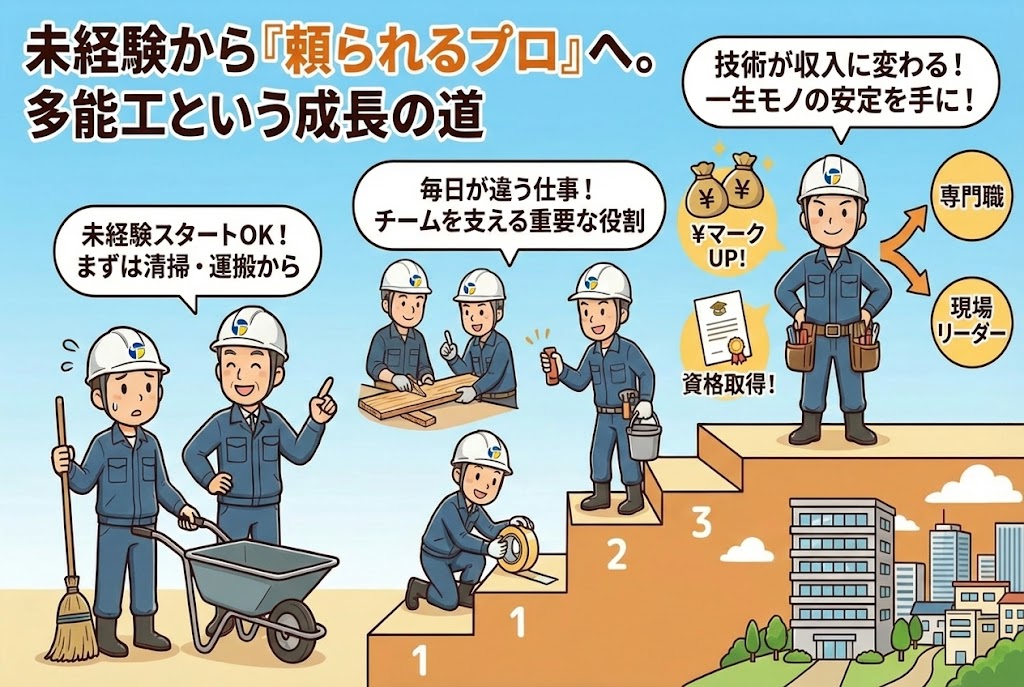 多能工とは、一つの作業にとどまらず、さまざまな現場業務をこなす職人のこと。専門職のようなスキルがなくてもスタートでき、やる気さえあればどんどん仕事を覚えられるのが特徴です。
